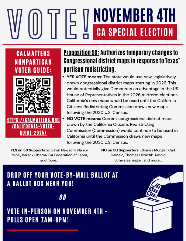 It's time to use your voice and vote! Proposition 50 is on the ballot this Tuesday, November 4th, and it's not too late to drop off your mail-in ballot or get to the polls. You may even be able to register to vote at the polls if you haven't yet! To learn more about Prop50, check out our flyer & the linked CalMatters voter guide.